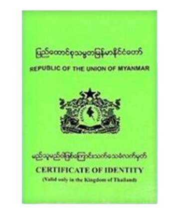 เอกสาร CI ของสัญชาติเมียนมาร์ แต่ละปีจะมีสีไม่เหมือนกันโดยปีล่าสุดจะมีลักษณะ สีเขียว สามารถใช้เดินทางเข้า-ออก ระหว่างประเทศไทย กับ ประเทศพม่าเท่านั้น ไม่สามารถใช้ในการเดินทางไปยังประเทศอื่นได้และ